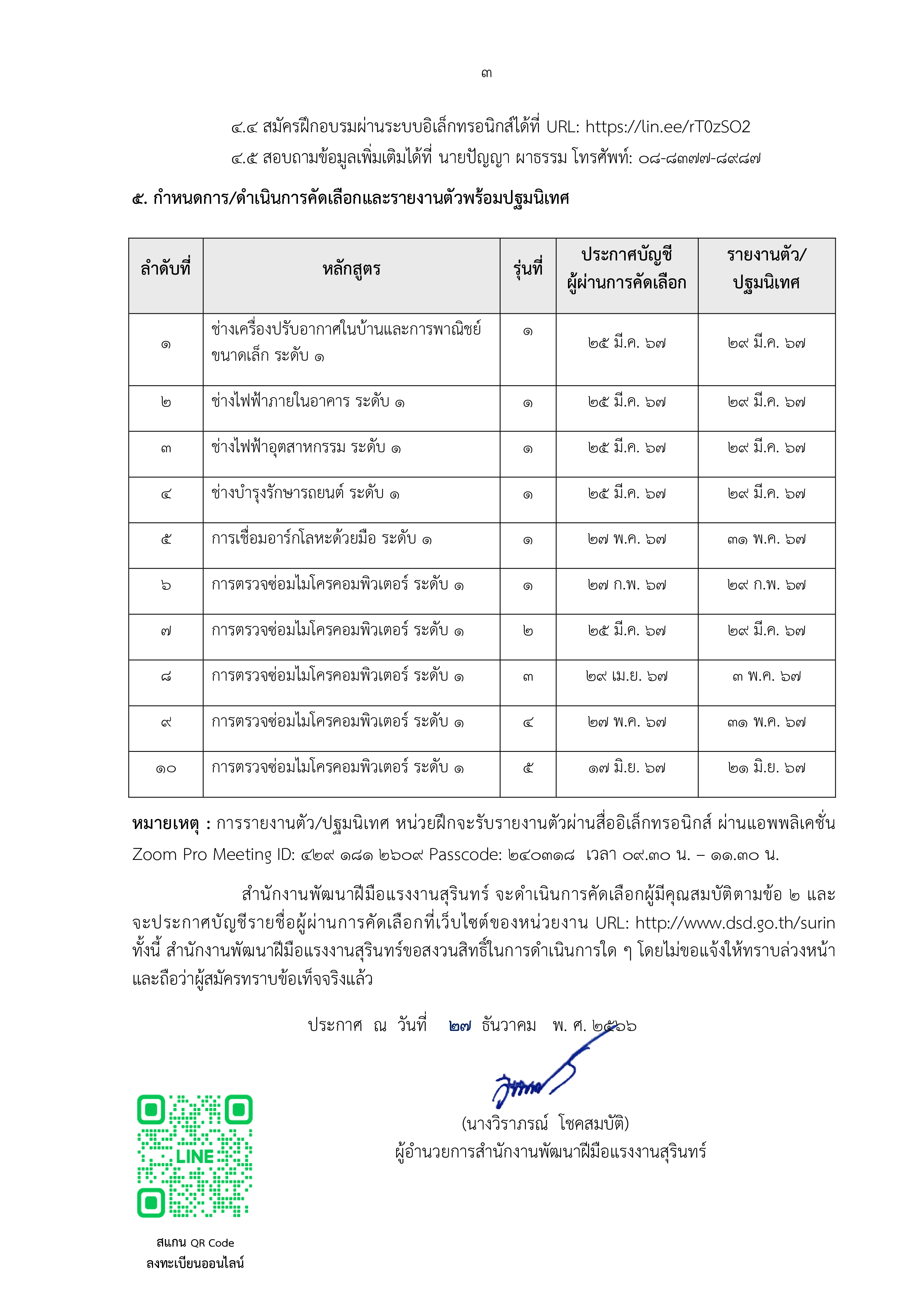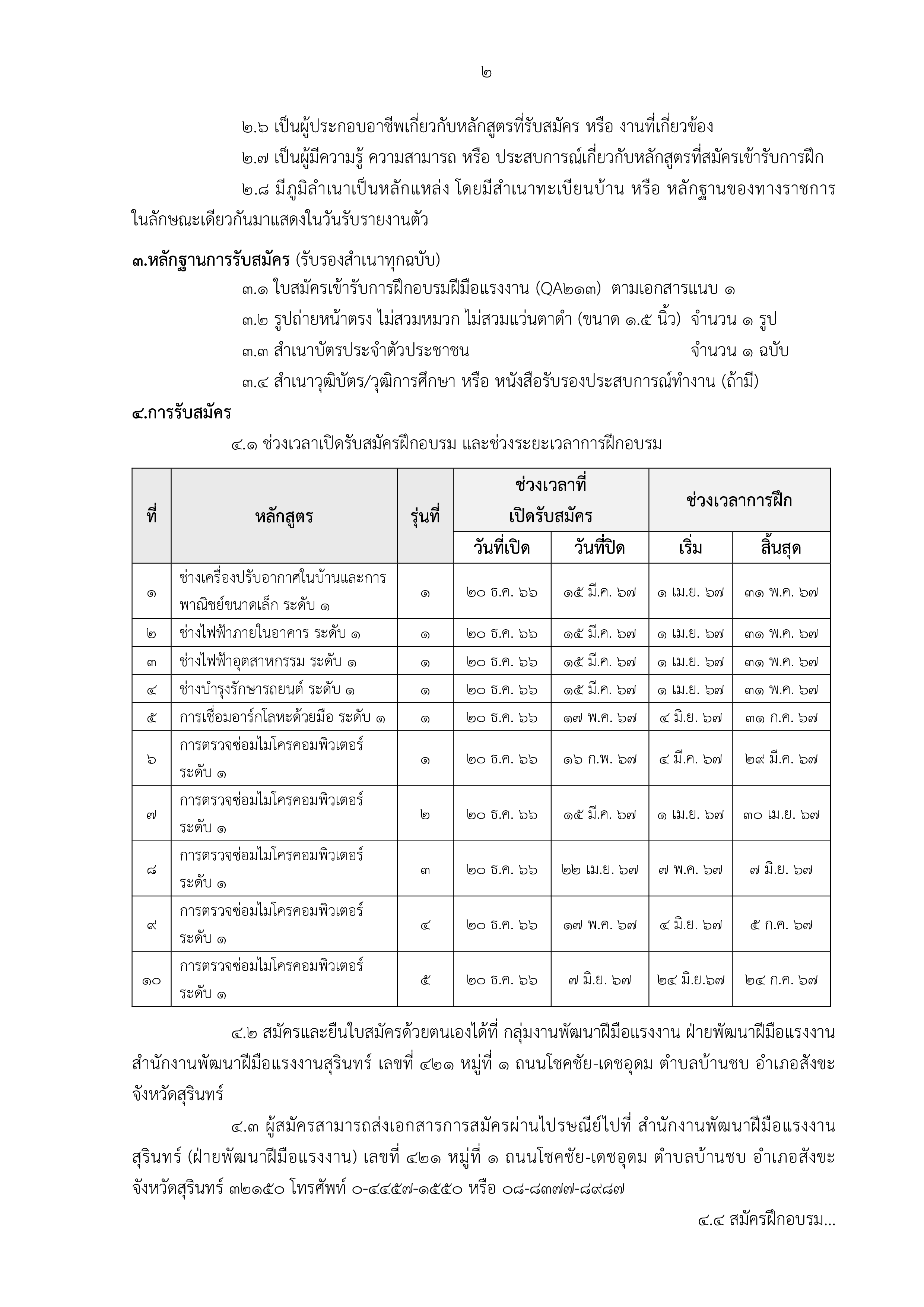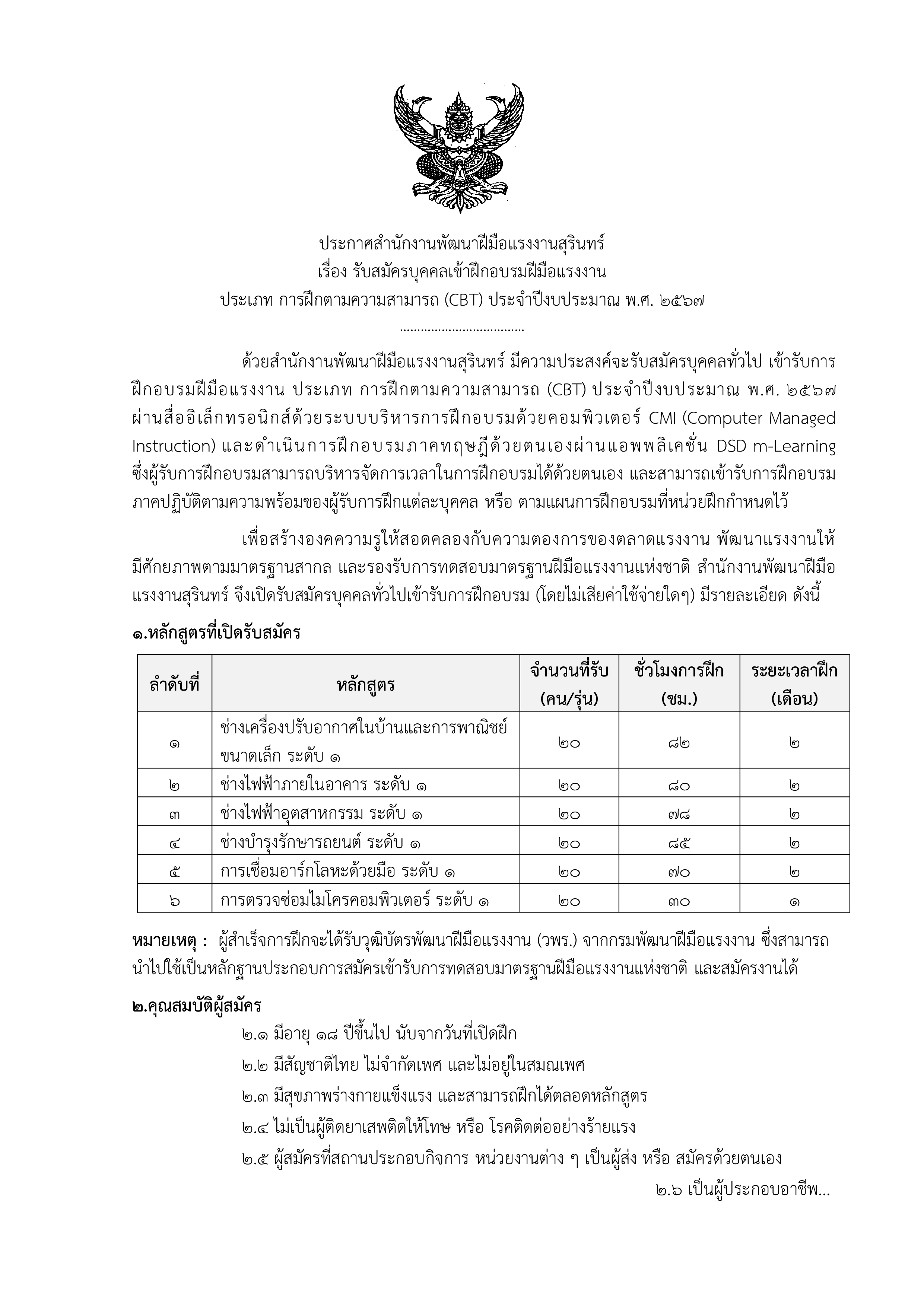 สำนักงานพัฒนาฝีมือแรงงานสุรินทร์ มีความประสงค์จะรับสมัครบุคคลทั่วไป เข้ารับการฝึกอบรมฝีมือแรงงาน ประเภท การฝึกตามความสามารถ (CBT) ประจำปีงบประมาณ พ.ศ. 2567 ผ่านสื่ออิเล็กทรอนิกส์ด้วยระบบบริหารการฝึกอบรมด้วยคอมพิวเตอร์ CMI (Computer Managed Instruction) และดำเนินการฝึกอบรมภาคทฤษฎีด้วยตนเองผ่านแอพพลิเคชั่น DSD m-Learning ซึ่งผู้รับการฝึกอบรมสามารถบริหารจัดการเวลาในการฝึกอบรมได้ด้วยตนเอง และสามารถเข้ารับการฝึกอบรมภาคปฏิบัติตามความพร้อมของผู้รับการฝึกแต่ละบุคคล หรือ ตามแผนการฝึกอบรมที่หน่วยฝึกกำหนดไว้ เพื่อสร้างองคความรูให้สอดคลองกับความตองการของตลาดแรงงาน พัฒนาแรงงานให้มีศักยภาพตามมาตรฐานสากล และรองรับการทดสอบมาตรฐานฝีมือแรงงานแห่งชาติ สำนักงานพัฒนาฝีมือแรงงานสุรินทร์ จึงเปิดรับสมัครบุคคลทั่วไปเข้ารับการฝึกอบรม (โดยไม่เสียค่าใช้จ่ายใดๆ) รายละเอียดตามเอกสารแนบ
